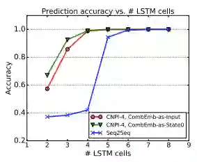 图 5:可调用参数的数量 K=4 时,对应组合子集合包含 57 个组合子。用三种模型分别学习整个集合,模型 LSTM 单元数与预测精度的关系。