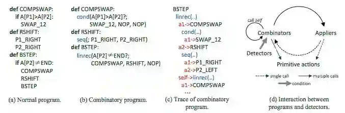 组合子定义为一个「程序模板」,形参作为要填的空,可以是要调用的子程序。用另一个称为应用子(applier)的程序来包裹组合子,即可表示实际的程序。当执行组合子的时候,应用子调用组合子,将实参传递给组合子。组合子的实参可以是一组实际的程序,也可以是包裹结构的程序(即应用子),这样就能反复组合,构造出越来越复杂的程序了。与原始 NPI 相似的是,核心控制器对组合子的解释取决于一个轻量级的特定域编码器的输出。这个编码器我们称为探测子(detector),也由应用子动态地提供。图 1 为引入组合子抽象的 NPI 新架构。