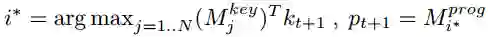 NPI 的推理过程如下(详见论文 Reed & de Freitas (2016) 第 3.1 节和算法 1)。在时间步 t 上,编码器 f_enc 接收环境观测量 e_t 和参数 a_t,输出状态 s_t。核心 LSTM 网络 f_lstm 接收状态 s_t、程序嵌入向量 p_t∈ R^P 和上一个隐状态 h_t-1,从而更新自身的隐状态 h_t。根据最顶层 LSTM 的隐状态,多个解码器可产生如下输出:返回概率 r_t、下一个程序的键嵌入向量 k_t+1,以及下一个程序的参数 a_t+1。通过对比键嵌入向量 k_t+1 与键存储器 M_key 中的每一行,可得到下一个程序的 ID。于是,从存储了 N 个程序的程序存储器 M_prog 中可以获取下一个程序的嵌入向量:
