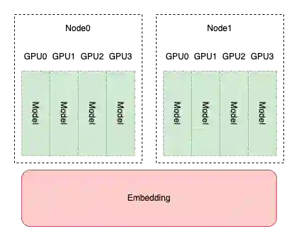 在推荐系统中,模型主体参数相较 Embedding 则小的多。因此我们一般将 Embedding 部分设置为模型并行,模型主体设置为数据并行。通过使用多机多卡,可进一步提升 Embedding 大小。