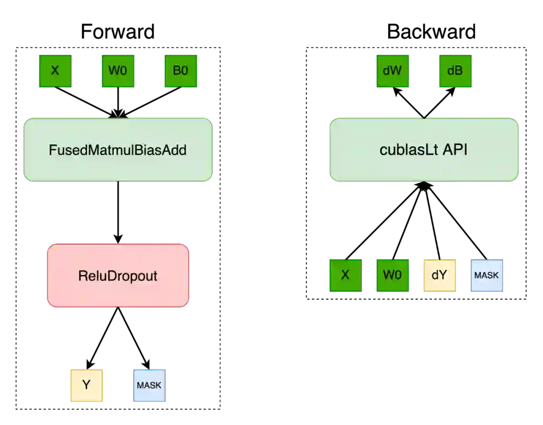 而对于带 Dropout 操作的全连接层,OneFlow 深度定制了其中的 ReluDropout 操作,使用 bitmask 形式存储前向产生的 mask,在反向传播中,通过设置 cublasLt 矩阵乘的参数 alpha=dropout_scale 以实现反向算子融合。