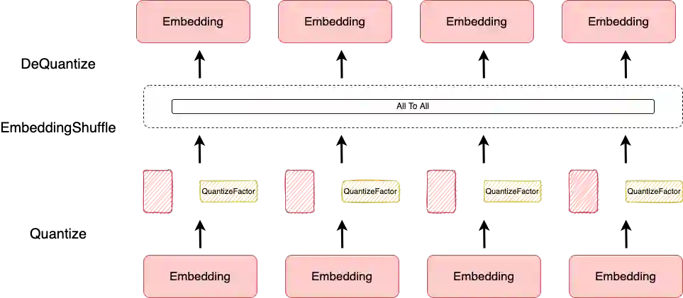 并行训练中,各个 Rank 之间需要通信以交换 Embedding 数据,我们先将浮点类型数据量化成 int8 类型,交换完后再反量化恢复。