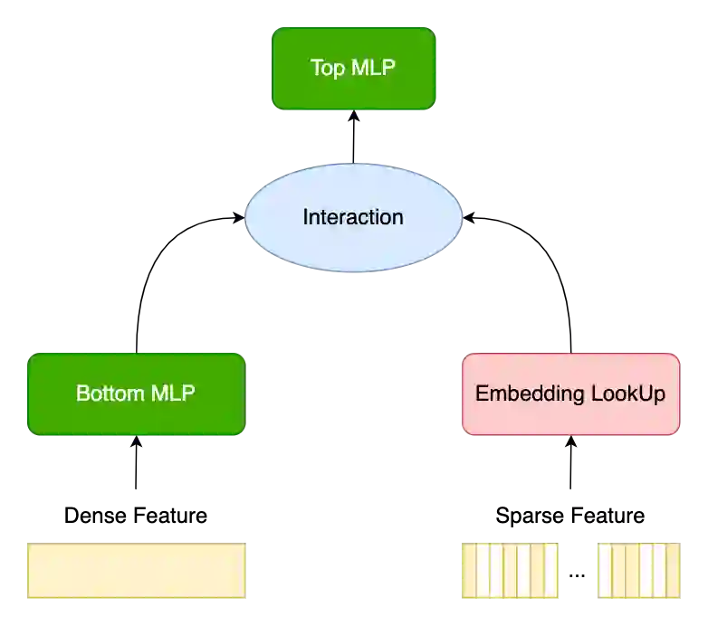 在 DLRM 模型中,Embedding 中的 Dense Feature 会进入到 Bottom MLP 中,而 Sparse Feature 经过 Embedding 查询得到对应特征。两者进入 Interaction 进行特征交叉,最后进入到 Top MLP。