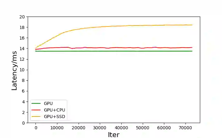 分别对三种存储方案进行测试。其中,测试用例与 MLPerf 的 DLRM 模型一致,参数规模约为 90GB。在使用 SSD 和 CPU 内存作为存储设备时,我们配置的 GPU 缓存大小为每个 GPU 12GB,相比于 90 GB 的总参数量,只能有一部分参数保持在 GPU 显存内,其他的参数则是保存在 CPU 内存或者 SSD 上,随着训练过程动态的换入到 GPU 缓存中来,测试结果如下图。