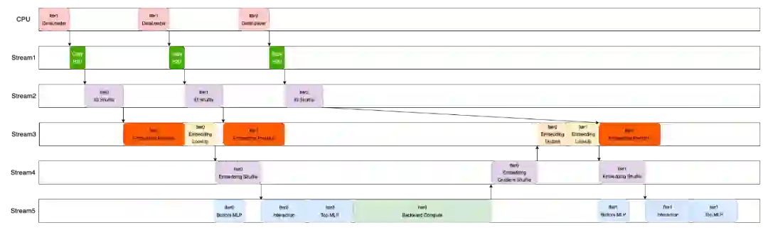 在 Embedding 数据查询交换的过程中,与 Embedding 操作无关的 Dense Feature 可以进入到 Bottom MLP 进行计算,在时间上进行重叠。完整的重叠执行时序如下图所示。