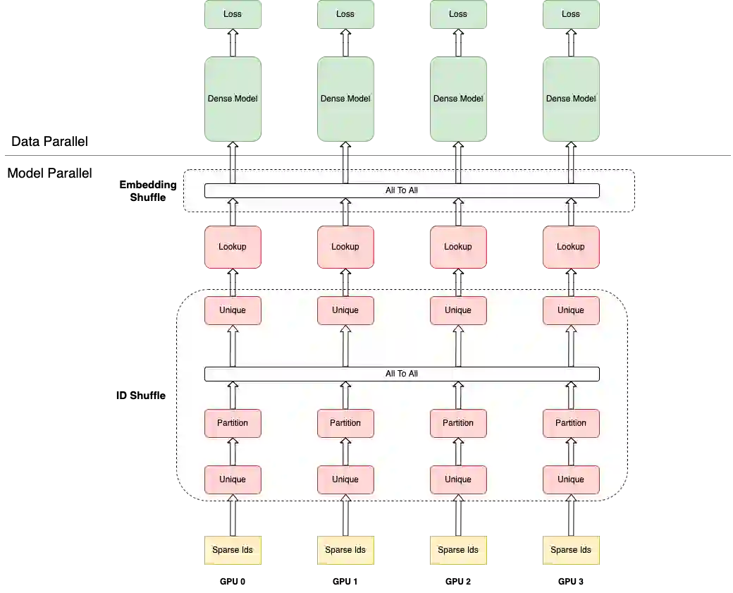 具体到实现细节,每个 Rank 各自负责一部分 Embedding 的存储,特征 ID 进入到各个 Rank,可能存在重复 ID 的情况,首先要进行去重(即下图的 ID Shuffle);各个 Rank 拿着去重后的 ID 去查询 Embedding,得到对应的局部数据,所有 Rank 数据合并后各 Rank 得到完整的 Embedding 数据(即下图的 Embedding Shuffle);最后,各 Rank 以数据并行的方式完成整个模型训练过程。