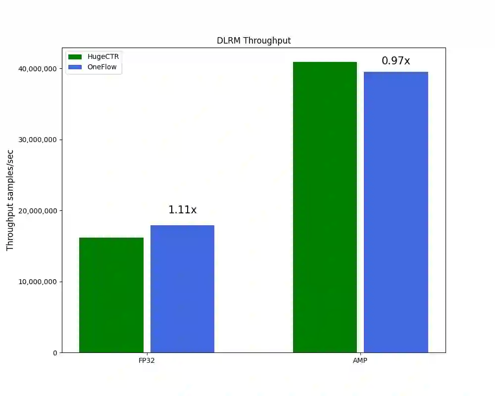 通过分层存储让单卡也能支持 TB 级模型的训练,通过横向扩展让模型容量没有天花板,通过 OneFlow 的自动流水线机制、算子优化和通信量化压缩等技术实现极致性能,在用法像 PyTorch 一样简单的前提下, OneEmbedding 在 DLRM 模型上性能是 TorchRec 的 3 倍以上,开启 TorchRec 没有支持的混合精度后,OneEmbedding 的性能更是 TorchRec 的 7 倍以上。
