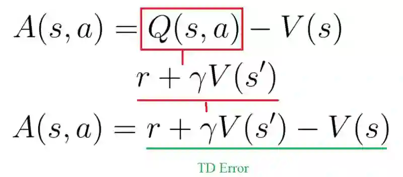 实现这个优势函数的需要两个值函数-- Q(s,a) 和 V(s) 。幸运的是,我们可以使用 差分时间序列误差TD Error 作为该优势函数的(无偏)估计。