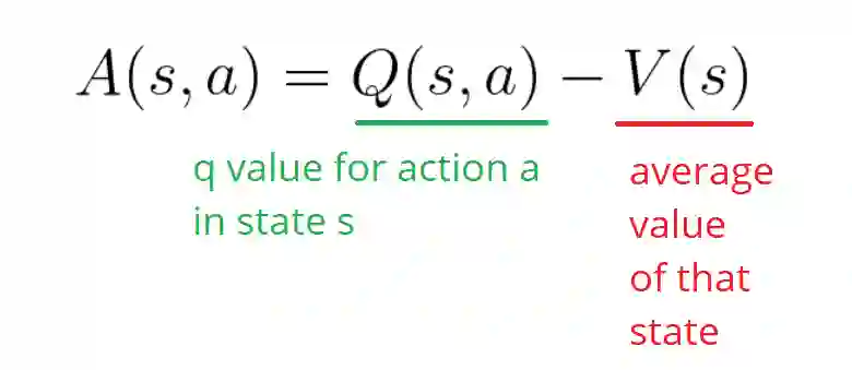 该函数给出相比在当前状态下采用平均行动(动作值函数)的优势值。换句话说,如果我采取这个行动,该函数计算我这个行动得到的奖励。