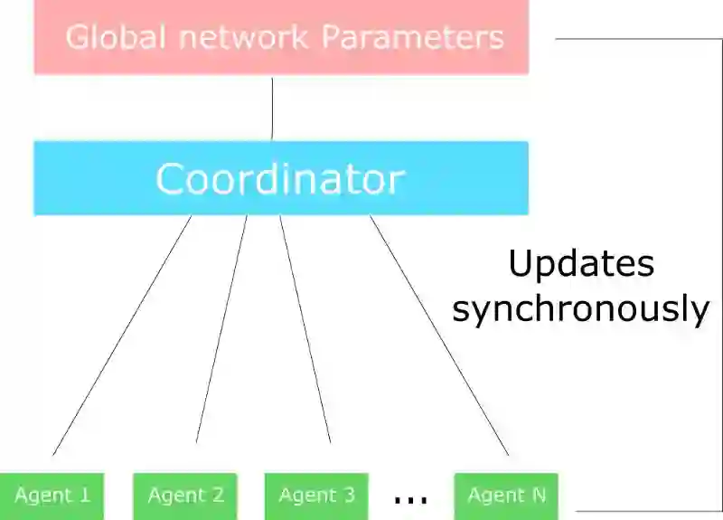 另一方面,A2C与A3C的唯一区别是A2C是同步更新全局网络。我们等到所有works完成训练后,计算他们的梯度的均值,以更新全局网络参数。