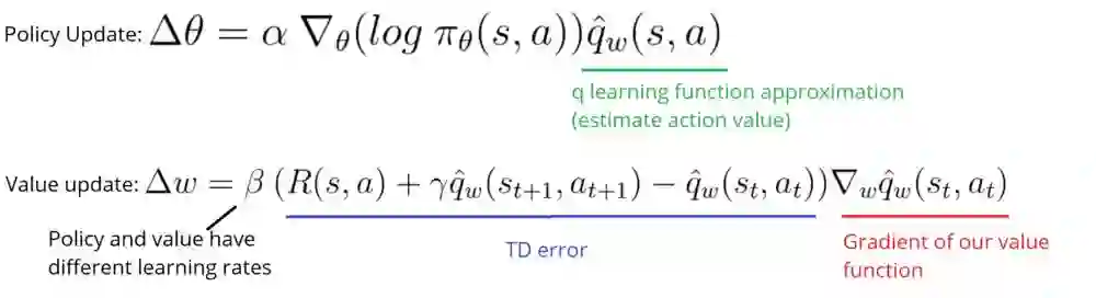 因为每个时间步都进行参数更新,所以不再使用总回报R(t)。我们还需要训练一个与值函数近似的评论家模型(记得,值函数是通过给定状态和动作计算的最大未来回报的期望值)。这个值函数被用来代替使用策略梯度时的奖励函数。