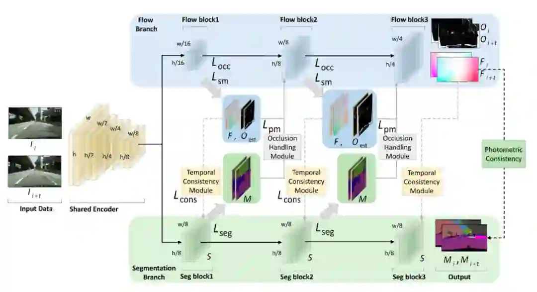 为了解决上述两个问题,作者提出了一个光流和语义分割联合学习的框架,语义分割为光流和遮挡估计提供了更丰富的语义信息,而非遮挡得光流保证了语义分割的像素级别的时序一致性。