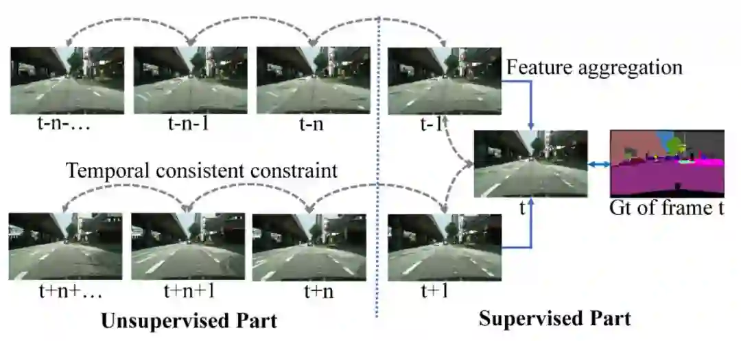 通过这种约束学习,标注信息可以从一帧传播到其他的未标注帧,而即使是两个未标注帧也可以通过一致性来学习。
