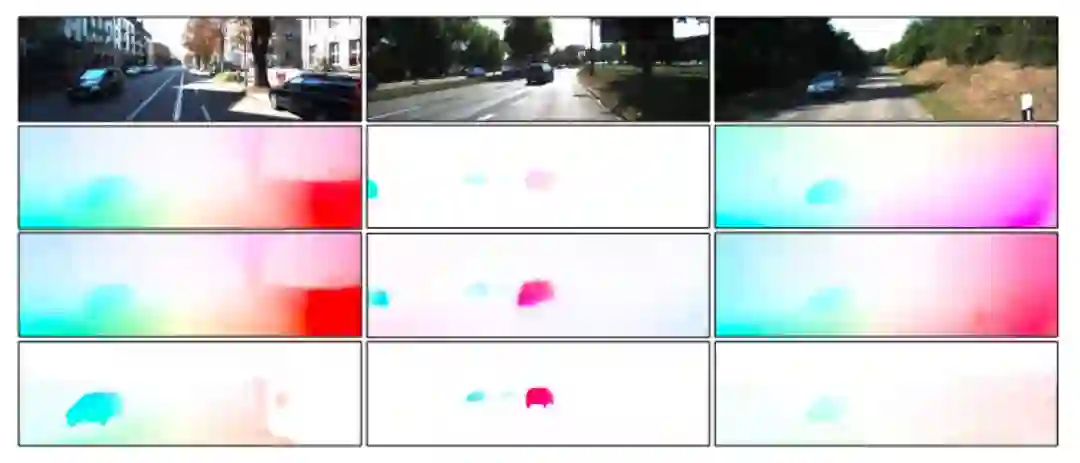 图5:KITTI数据集上光流估计结果,从上至下分别为原图,本文算法估计结果,GeoNet估计结果和GT。