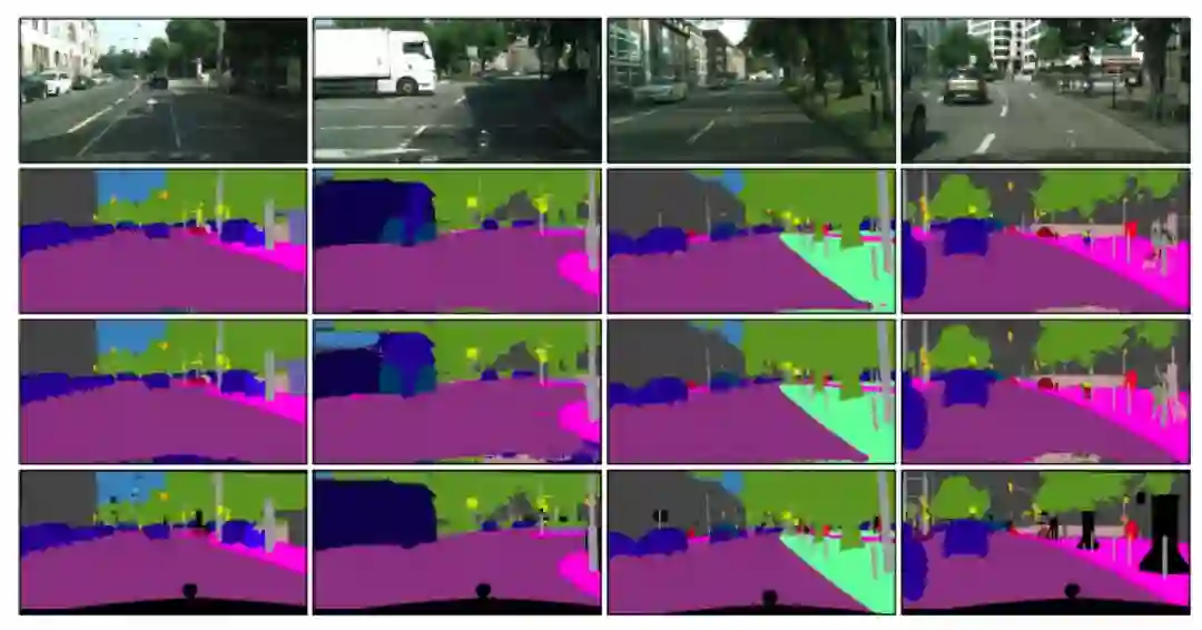 Cityscapes验证集分割结果,从上至下分别为原图,本文算法分割结果,PSPNet分割结果和GT。