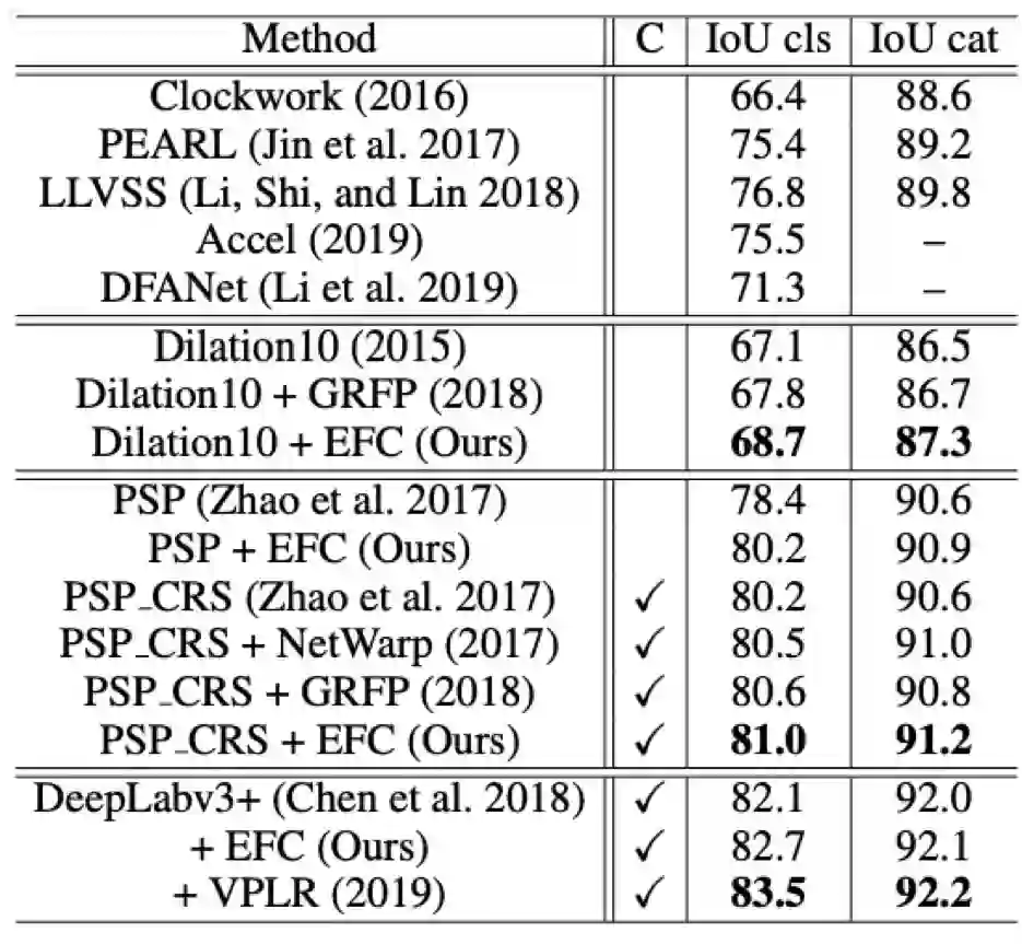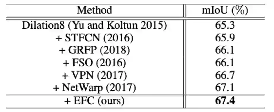 (Fayyaz et al. 2016; Jin et al. 2017; Gadde,Jampani, and Gehler 2017; Nilsson and Sminchisescu 2018; Hur and Roth 2016) 通过光流指导的特征融合来获得更好的分割准确率。