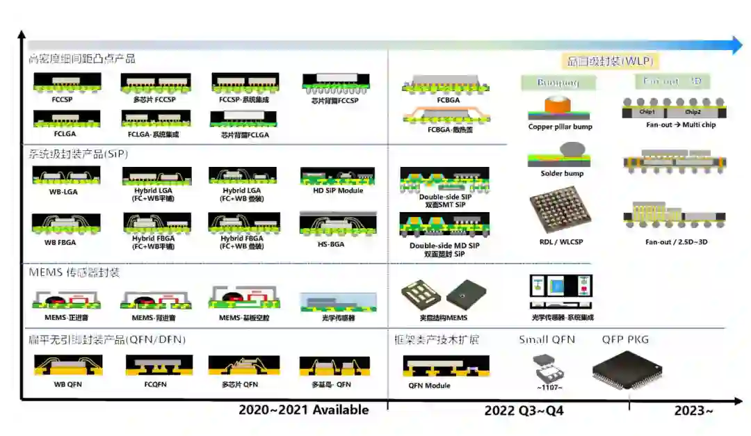目前,甬矽电子主要聚焦中高端先进封装和测试业务,涵盖高密度细间距凸点倒装(FC)、系统级封装(SiP)、扁平无引脚封装(QFN/DFN)、微机电系统传感器(MEMS)四大类,主要应用于射频前端芯片、AP类Soc芯片、触控芯片、Wi-Fi芯片、蓝牙芯片、MCU等,面向物联网、电源管理及计算类等场景。