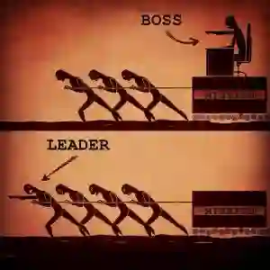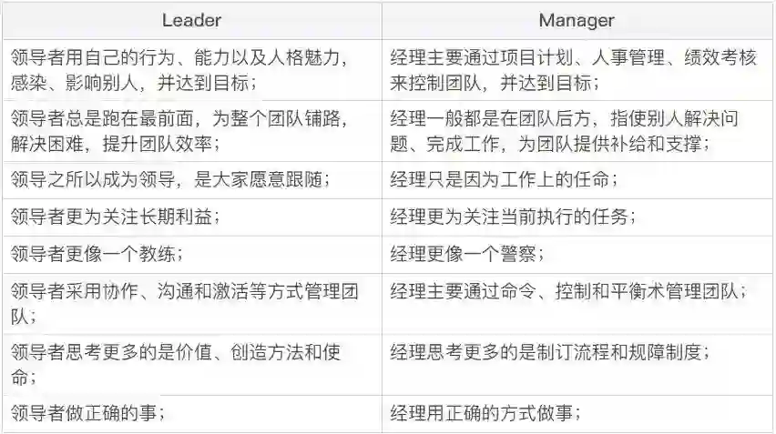 网上可以找一个 Leader vs Manager 的图(如下图),Leader 身先士卒,而经理则更像一个奴隶主或官员。