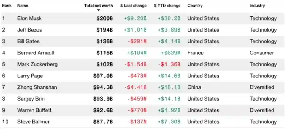 【身价2000亿美元,马斯克重新登顶世界首富】据彭博亿万富翁指数显示,特斯拉CEO马斯克重新成为世界首富,其资产达到2000亿美元;此前,有媒体报道称,马斯克旗下SpaceX完成新一轮融资,从红杉资本牵头的投资者手中融资8.5亿美元,SpaceX在此轮融资中估值为740亿美元,较8月份增长了60%,使得马斯克净资产增加了约110亿美元。