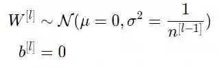 层l中的所有权重均自正态分布中随机挑选,其中均值 μ=0 ,方差E= 1/( n[l−1]),其中n[l−1] 是第l-1层网络中的神经元数量。偏差已初始化为零。