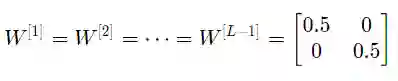类似地,如果每个权重的初始化值都比单位矩阵稍小,即: