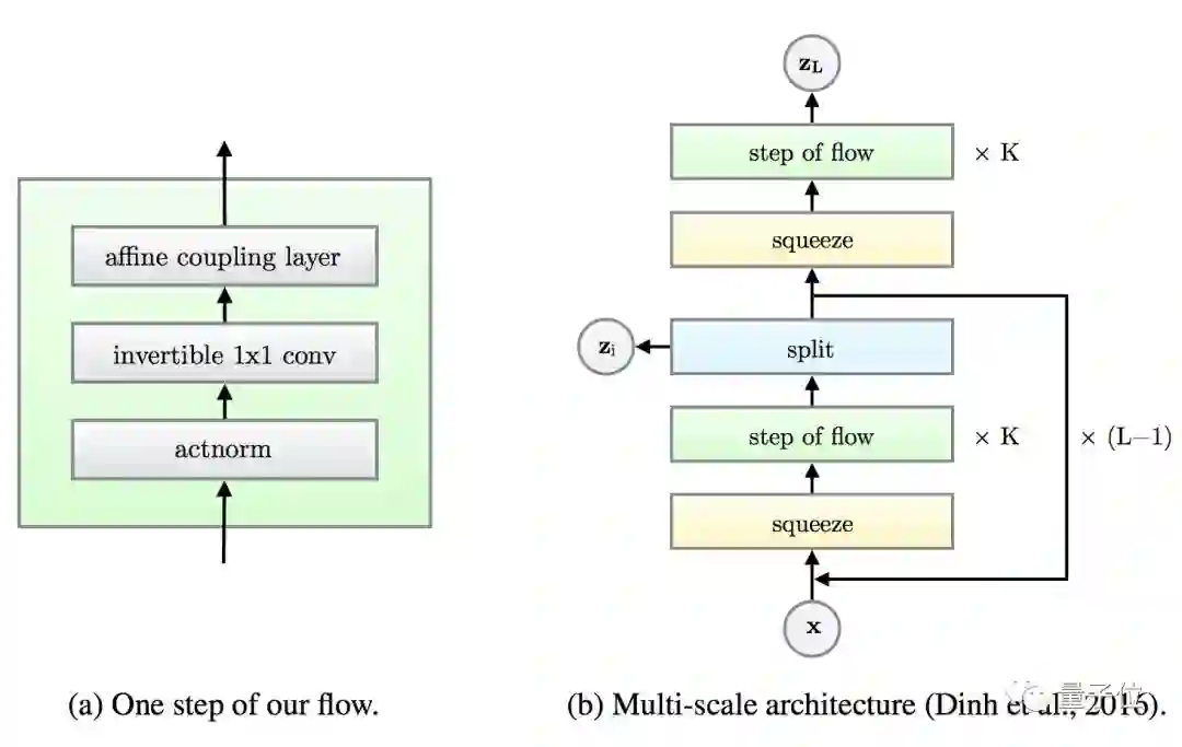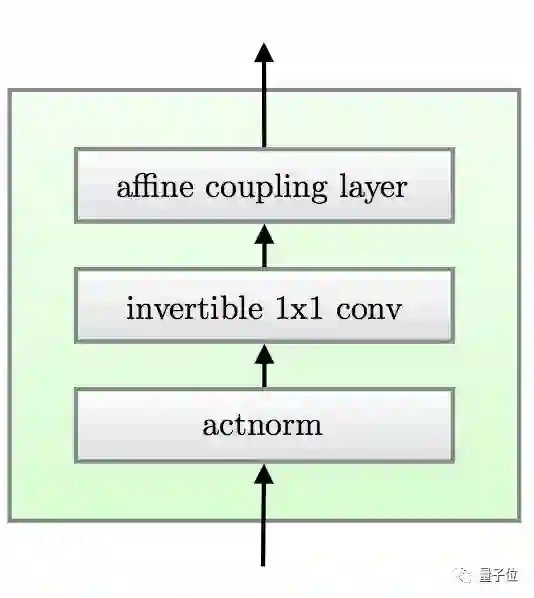 每一步 (绿框) ,都要从一个actnorm步骤开始,把激活神经元归一化 (Activation Normalization) 。