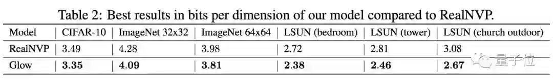 除了肉眼可辨的效果之外,团队还对比了Glow和前辈RealNVP (来自2016年的Dinh实验室) ,处理数据集时的成绩——