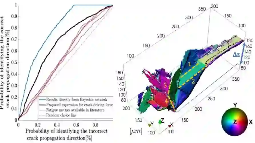 由美国普渡大学Michael Sangid领导的团队,提出了一种识别微结构小疲劳裂纹驱动力的新方法。他们采用机器学习建立了两个独立的贝叶斯网络,分析了钛合金原位疲劳循环过程中获得的衍射数据和X线断层影像数据。该方法能识别影响疲劳裂纹扩展方向和扩展速率的微机械和微结构变量。他们发现,第一主应力轴在特定方向上的取向和最大分辨剪切应力与裂纹扩展最为相关,将其纳入关系分析中可以描述裂纹扩展方向的概率。他们的分析模型可靠地预测了小裂纹扩展的方向,再现了实验结果,比之前文献的预测更为可靠。这种半监督机器学习方法不仅可以识别钛合金中小裂纹扩展方向背后的复杂变量,也有望识别其他复杂工程问题中的驱动力。