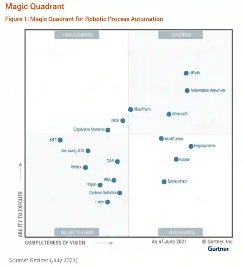 Gartner 近期调研数据显示,全球约有近100家RPA供应商,其中活跃的商业化产品厂商约有50-60家,而最后入围Gartner 魔力象限全球报告的只有15家。