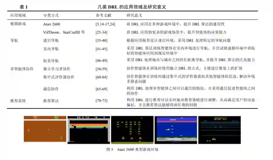 本文详述了基于值函数和策略梯度的 DRL 算法,对深度Q网络、深度策略梯度及相关算法进行了梳理,并概述了近年来DRL在视频游戏、导航、多智能体协作以及推荐系统等领域的应用。最后,总结了 DRL 目前面临的挑战,建议在采样和探索效率、奖励值设置、泛化能力等方面开展研究,更好地提升DRL算法的性能和应用效果。