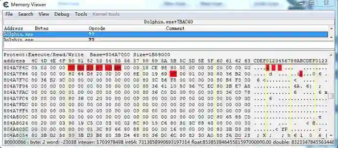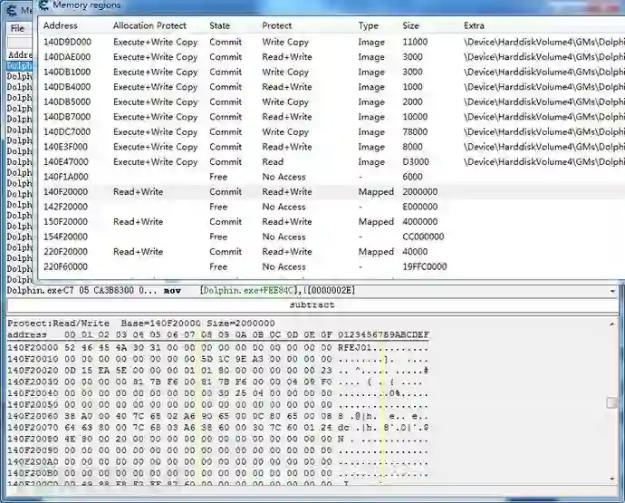 旧版的32位dolphin申请的模拟器地址基本是在7FFFFFFF-80000000区间,而新版取消了以往的直接申请模式,地址随机变化,因此我们首先第一步就是要把游戏的模拟内存找到,这样便于动静态分析。目前网上没有一个统一的办法可以直接找到,这里我通过多次尝试找到一个比较稳定的查找映射内存地址的办法,就是用CE的内存区域查看,寻找dolphin.exe的内存结束地址,往下的第一个大小为0x2000000的MAPEPED内存地址就是目标内存地址。