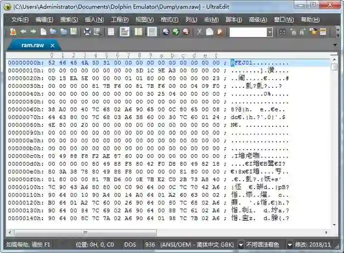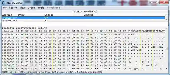 DOLPHIN在载入游戏镜像后,会申请一块内存用于模拟游戏内存,此内存有游戏的主要代码,其地址在每次游戏启动的时候随机申请,然后通过模拟机制模拟WII的系统运行,游戏内存运行的地址通过dolphin调试模式可以看到其模拟的地址始终从0x80000000开始。可以通过模拟器调试模式的内存->转储主内存把当前的主要内存保存为文件,位置在:C:\Users\你的账户名\Documents\Dolphin Emulator\Dump\ram.raw