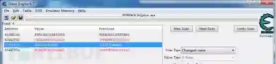 下面就开始查找这个随机数的地址。这里我们利用CE的变化值和非变化值的监控来达到目的,首先使用CE监控dolphin进程,并按照上述方法将ROM内存找到并重定位,利用未知初始值->变化的值->不变的值->变化的值…反复查找,最后找到有如下地址是可疑的
