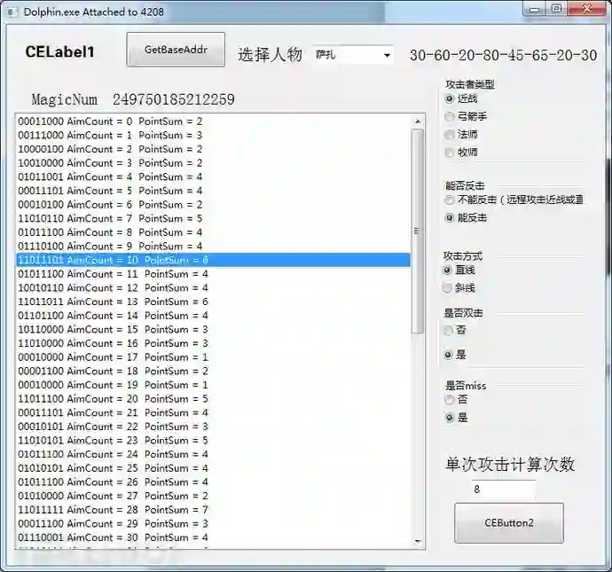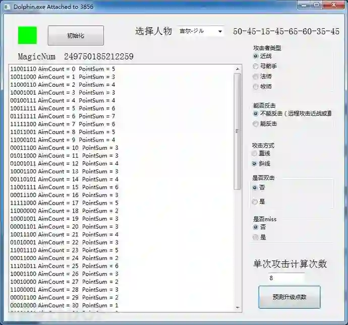 理想中的完全自动化是直接HOOK Dolphin的OPENGL显示,动态显示当前的乱数值,以及根据当前选择的人物瞄准攻击的目标,然后自动计算出改变乱数循环多少次升级属性的点数,由于对Dolphin代码研究不多加上自己懒,就只通过CE的Trainer实现了一个简化版的,通过确定此次攻击之后某个人物要升级,工具预测乱数值循环次数对升级属性的影响。