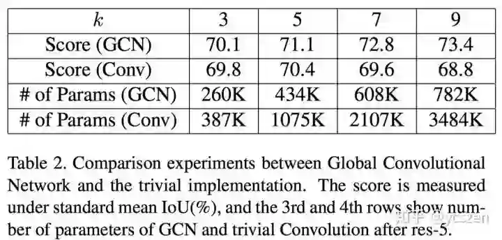 在GCN中,随着Kernel Size的增加,网络参数也随之增长,那么网络性能的提升是否得益于使用了更多的参数?为了证明提升来自于设计的有效性而不是增加了复杂度,文中设计了不同Kernel Size的GCN和普通Conv的对比实验。