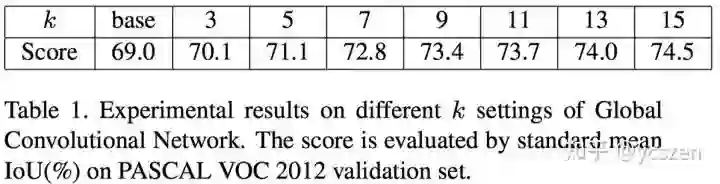 文中为了验证Large Kernel Conv的有效性,对比了不同Size的 Kernel,可以看到Kernel Size=15时比 Base Network整整高了5.5% mean IoU.
