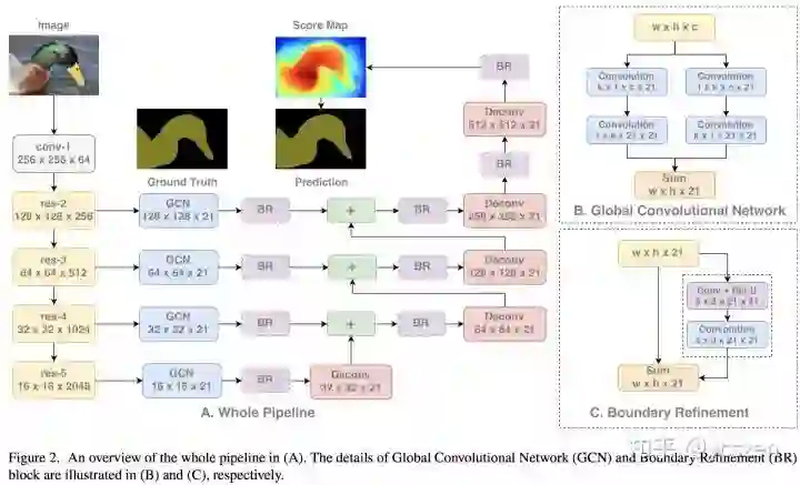 根据这两条Principle,本文提出了Global Convolutional Network(GCN)。如图3所示,这个方法整体结构正是背景介绍中提到的U-shape结构,其核心模块主要包括:GCN和BR。
