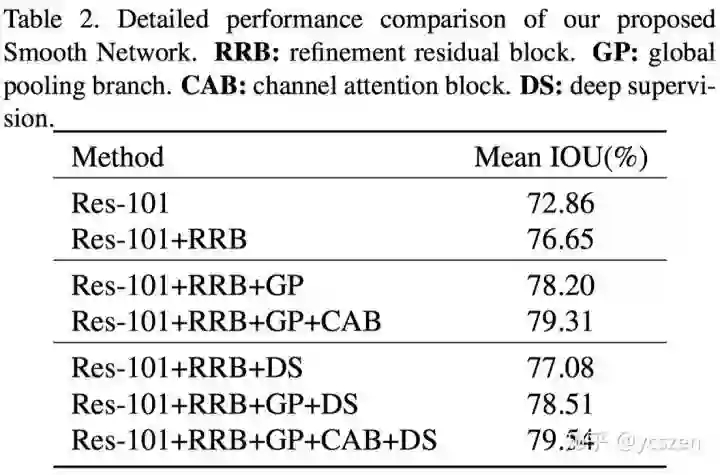 首先是对Smooth Network各部分的消融实验分析。可以看到Smooth Network非常有效,在PASCAL VOC 2012 Validation Set上可以达到Single Scale 79.54% mean IoU。