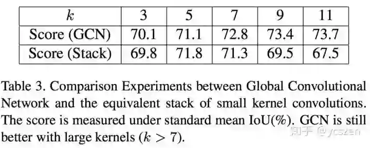 可以看到GCN依然优于普通Conv的堆叠,尤其是在较大Kernel Size的情况下。笔者认为这是一个很有价值的实验,可以启发我们去思考关于网络感受野的问题。我们以往认为,通过堆叠多个小核Conv可以达到和大核Conv一样的感受野,同时计算量还更少。最常见的应用比如VGG-Net。但是,实际上并非如此。