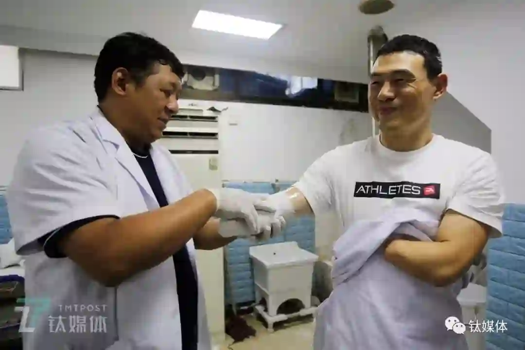 假肢公司临床中心主任沈杰伟在为倪敏成打石膏棉,以获取残肢模型来制作接受腔。