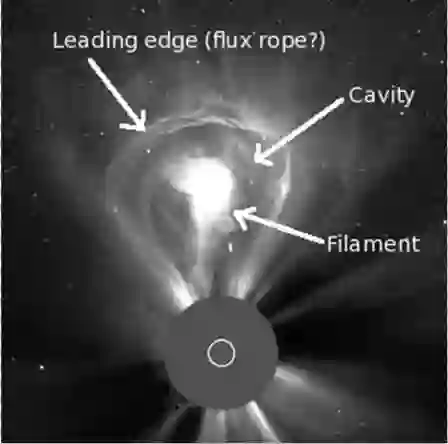 观测日全食的机会难得,怎样才能长时间监测CME呢?1930年,法国天文学家 Bernard Lyot 发明了第一台地面日冕仪,其基本设计是通过挡盘遮住太阳光球的光线,形成如同日全食的效果,然后就可以使人们不需要等待日食的发生就能在任何晴朗的白天对太阳日冕进行直接观测。第二次世界大战之后,空间太阳观测技术飞速发展。60年代以后,美国和前苏联开始利用人造卫星对太阳进行更加多样化的观测。CME的第一次清晰观测来自“轨道太阳天文台-7(OSO-7)”,随后一系列的空间探测卫星的长期观测使得CME的研究开始蓬勃发展起来。高质量的观测数据显示,CME经常是长这样的: