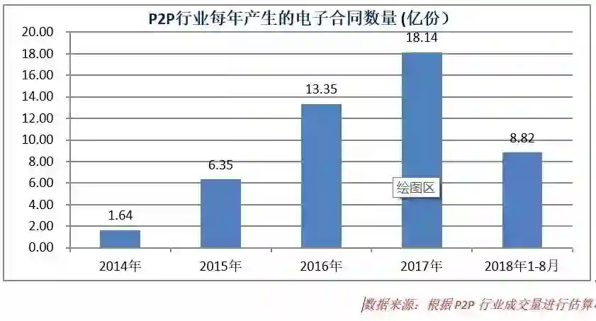 假设以二者平均值1546元为行业平均值,以一笔交易对应一份电子合同,基于行业成交量数据,可大致估算出自2014年以来,P2P行业共诞生电子合同48.31亿份,仅2017年就有18.14亿份。