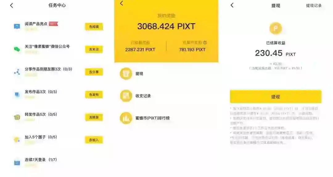 创作者上传原创作品,受到其他用户关注后即可获得像素蜜蜂平台积分PIXT(蜜蜂币);而其他用户则可通过转发、评论点赞、作品点赞等行为来赚取PIXT。这背后还有一条隐形规则是,用户积累粉丝越多,收到或发出的每个评论或点赞的对应币值越大。
