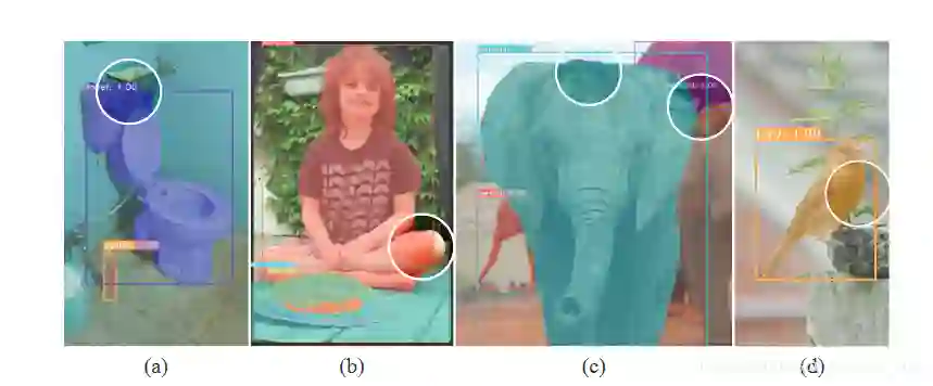 以目标检测为例,下面Figure1的(a)(b)检测出的框偏小,(c)(d)检测出的框偏大,如果我们充分利用目标检测和实例分割任务之间的相互关系,可以轻松纠正大多数这些错误。