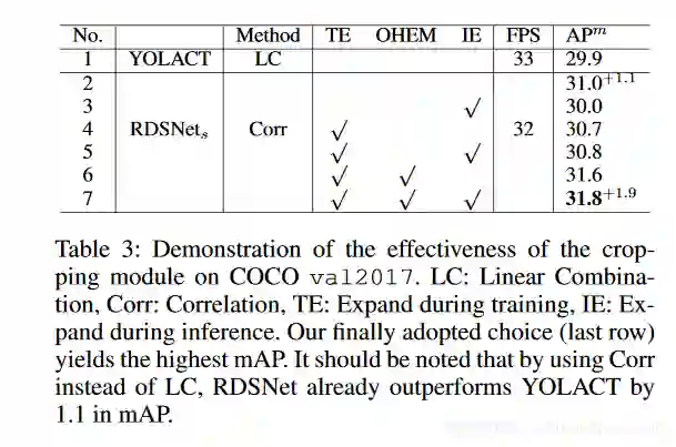 下面的Table3展示了相比于YOLACT,本文的RDSNet提升了近2个mAP值,证明了这种方法的有效性。