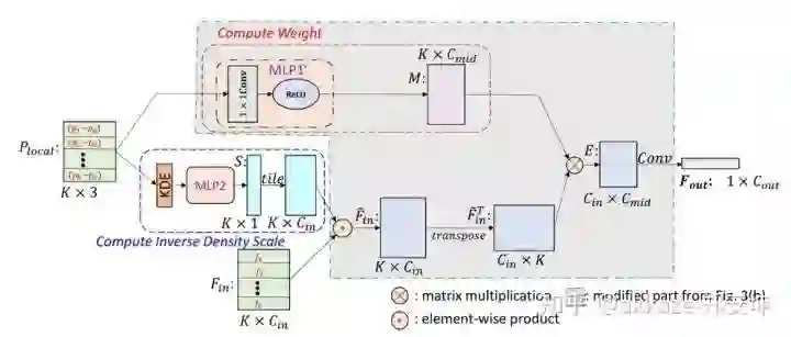 其中,S 表示逆密度系数函数。连续函数 W 可以用多层感知器(MLP)近似。函数 W 的输入是以 (x, y, z) 为中心的 3D 邻域内的 3D 点的相对坐标,输出是每个点对应的特征 F 的权重。S 是一个关于密度的函数,输入是每个点的密度,输出是每个点对应的逆密度系数。这个非线性的函数同样可以用一个多层感知机近似。