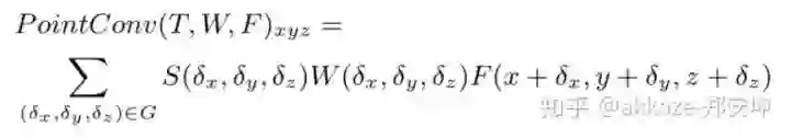 其中,W 和 F 均为连续函数,(x,y,z)(x,y,z) 是 3D 参考点的坐标,(δx,δy,δz)(δx,δy,δz) 表示邻域 G 中的 3D 点的相对坐标。上式可以离散化到一个离散的 3D 点云上。同时,考虑到 3D 点云可能来自于一个不均匀采样函数,为了补偿不均匀采样,使用逆密度对学到的权重进行加权。PointConv 可以由下式表示,