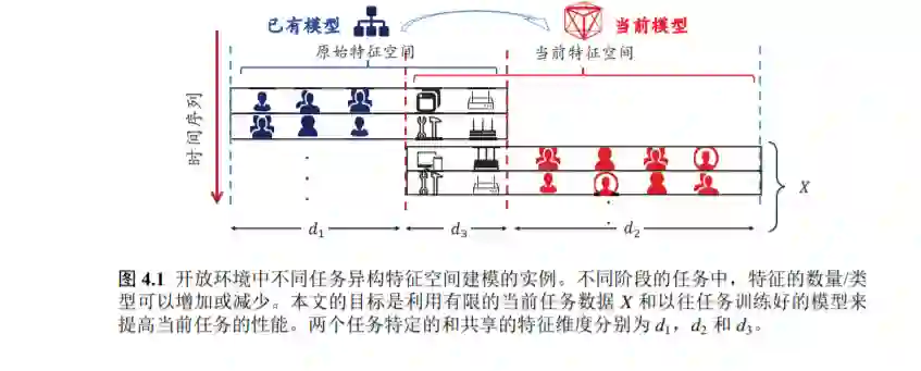 除了仅有少量的训练样本,当在开放环境下处理新的任务时,模型也会 面临特征空间变化的挑战。本文利用特征之间的关联性,提出构建特征的 “元表示”空间,利用在该空间中学习的度量,将已有特征空间的分类器 转换到新的特征空间上,以“重用”已有的训练好的异构分类器。提出的 ReForm 方法也降低了学习算法的样本和计算需求。值得一提的是,在ReForm 方法重用分类器的过程中,没有历史训练数据的传输,而仅仅需 要已有的模型,这也保护了不同阶段、不同任务之间数据的隐私性。