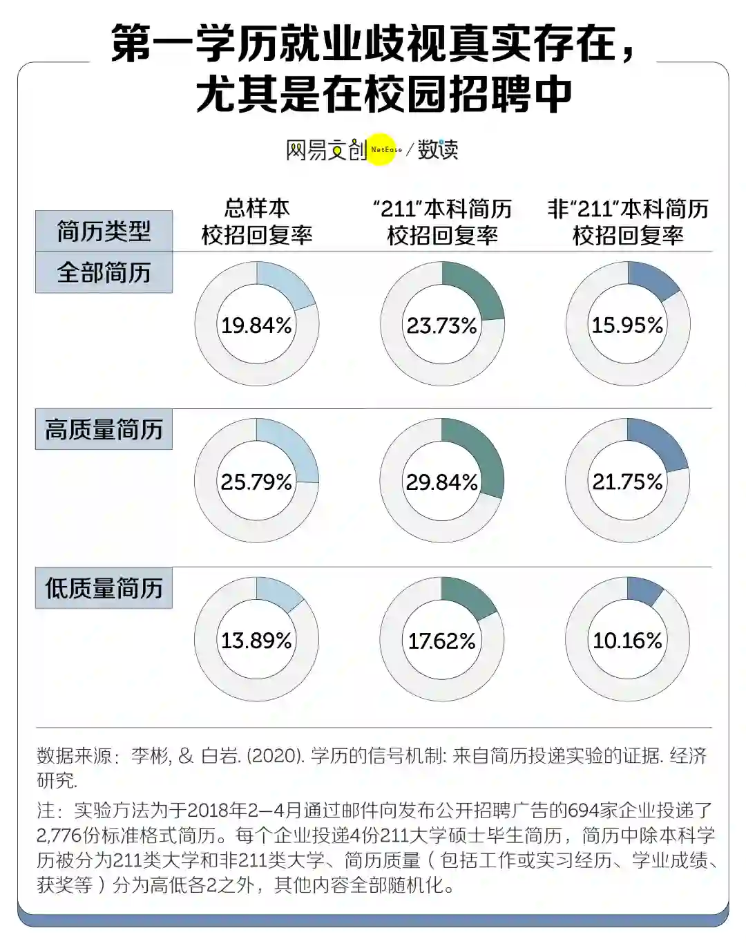 中央财经大学学者就通过一项实验证明,求职时的第一学历歧视真实存在,且在校园招聘中尤其严重。