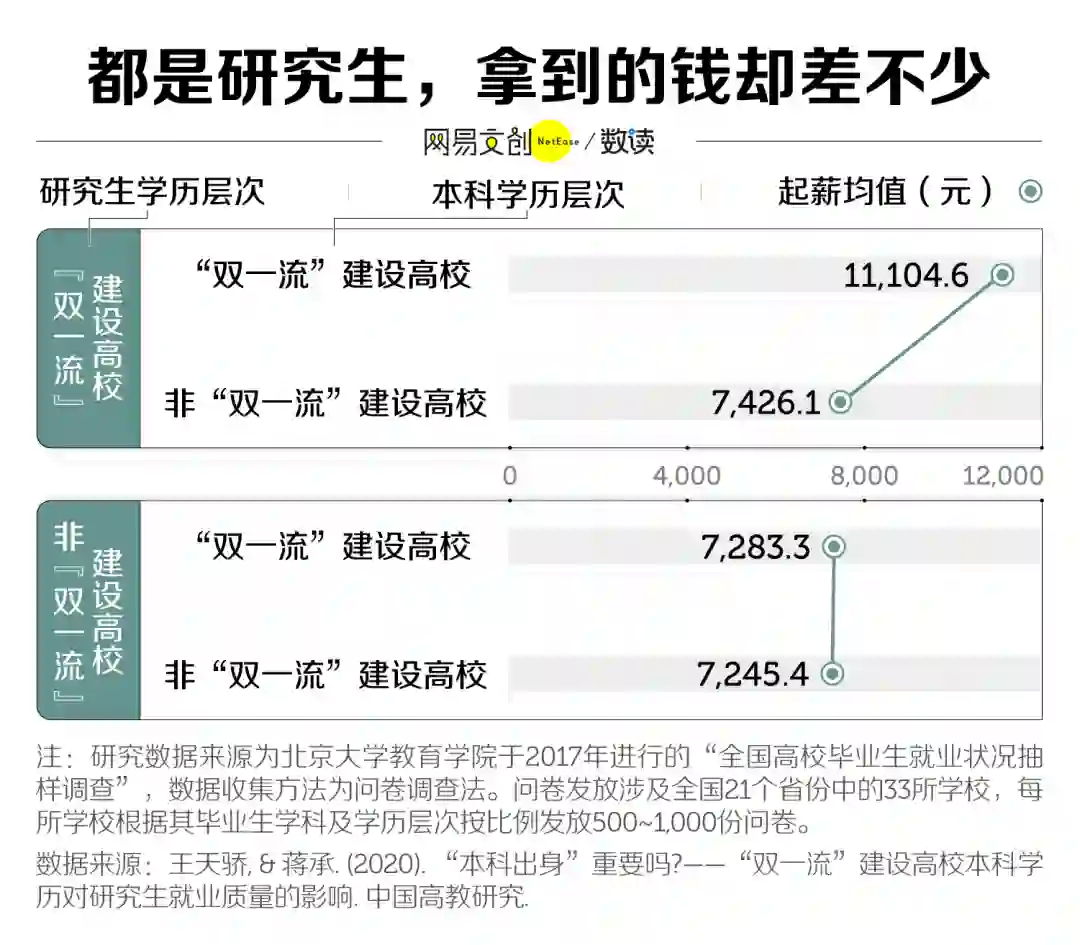北京大学某课题组的一项研究表明,研究生同为双一流高校,本科学历为双一流的学生平均起薪为 11104.6 元,本科为非双一流的仅有 7426.1 元,比前者将近低 3700 元。并且,起薪差异中有 52.9% 正是学历筛选歧视所造成的 [5]。
